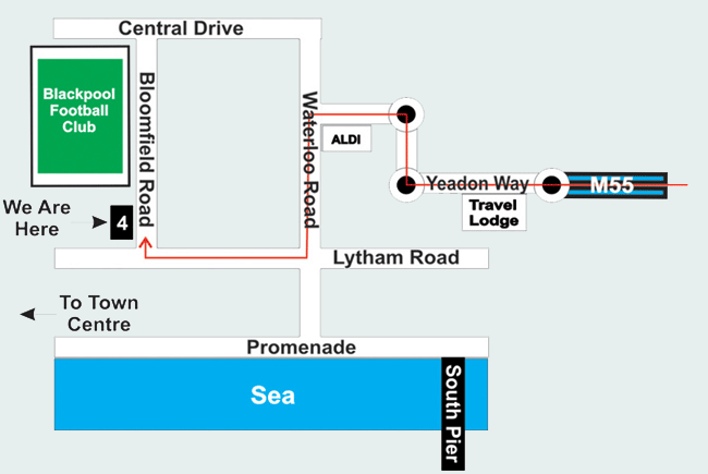 From M6 Jct 32 to M55 to Blackpool. Go to the end of the motorway, straight over the first and second roundabouts . Pass a Travel Lodge on the left. Turn right at the next roundabout and follow the road round to the left and turn left at the lights onto Waterloo Road. Next lights turn right onto Lytham Road and next main set of lights turn right onto Bloomfield Road and we are on the left hand side.